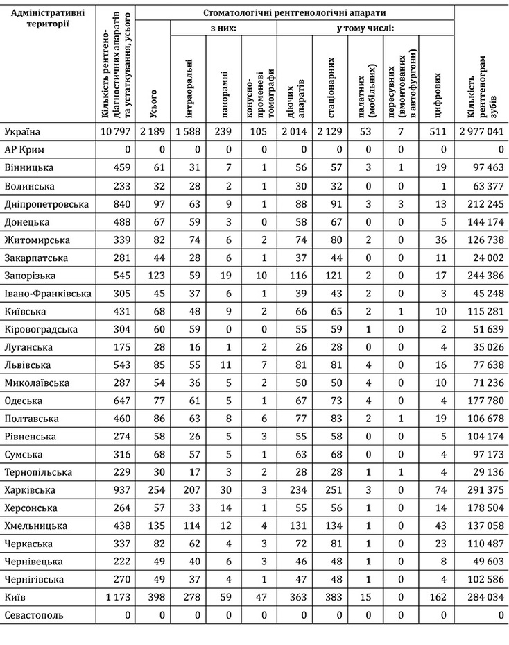 Для обізнаності керівників закладів надаємо аналітично-статистичну інформацію щодо наявного рентгенологічного обладнання за його видами в регіонах країни та кількості проведених рентгенограм зубів (табл.). Інформація зведена по закладах охорони здоров’я системи МОЗ, відомчих та приватних, за 2020 рік. Дані МОЗ отримало від департаментів (управлінь) охорони здоров’я ОДА та КМДА.