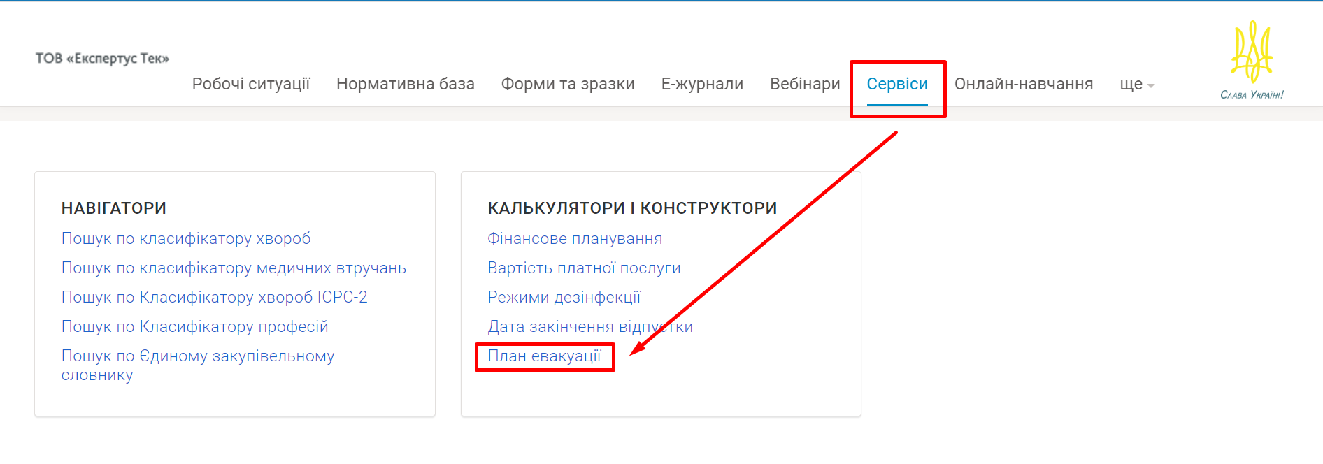 Ми розмістили сервіс «Конструктор Плану евакуації людей у разi пожежі» у розділі «Сервіси»: