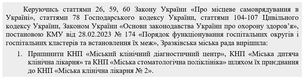 Наведемо витяг із рішення міської ради про реорганізацію підпорядкованих їй клінічного діагностичного центру, дитячої лікарні і стоматологічної поліклініки через приєднання до клінічної лікарні: