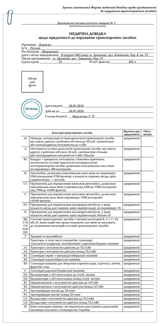 Згідно з пунктом 1.7 Положення про медичний огляд кандидатів у водії та водіїв транспортних засобів, затвердженого наказом МВС, МОЗ від 31.01.2013 № 65/80 (далі — Положення № 65/80), за результатами проведення попереднього, періодичного та позачергового медичних оглядів видають медичну довідку щодо придатності до керування транспортним засобом, форму якої затверджено додатком 1 до Положення № 65/80. До того ж на зворотному боці міститься Інструкція про заповнення бланка медичної довідки щодо придатності до керування транспортним засобом. Відповідно до цієї інструкції, довідку розбірливим почерком заповнює голова медичної комісії, що проводить попередній, періодичний чи позачерговий медичні огляди водія (кандидата у водії) транспортного засобу. Прізвище, ім’я та по батькові кандидата у водії або водія вписують повністю згідно з паспортними даними.