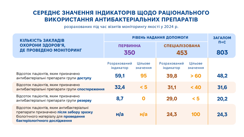Результати свідчать про серйозні прогалини в дотриманні вимог Стандарту № 1513. Узагальнені показники демонструють розподіл використання антибіотиків за класифікацією AWaRe (доступ, спостереження, резерв), а також відображають своєчасність бактеріологічних досліджень для того, щоб ідентифікувати збудника...