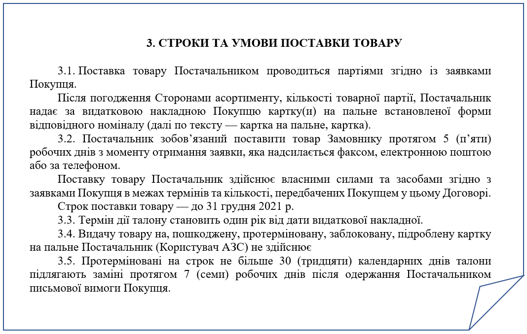 Медзаклад-КНП уклав договір поставки пального 15 грудня 2021 року і закупив за ним талони (картки) на бензин і дизпаливо. Про ці талони йдеться в розділі 3 договору про строки та умови доставки товару: