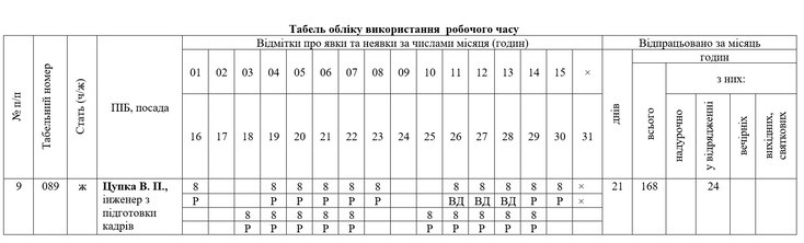 Доповніть розділ «Відпрацьовано за місяць» табеля окремою графою, щоби відображати робочий час у відрядженні. Це допоможе бухгалтерії розраховувати зарплату. Адже роботу працівникам, направленим у відрядження, оплачують у розмірі не нижче середнього заробітку