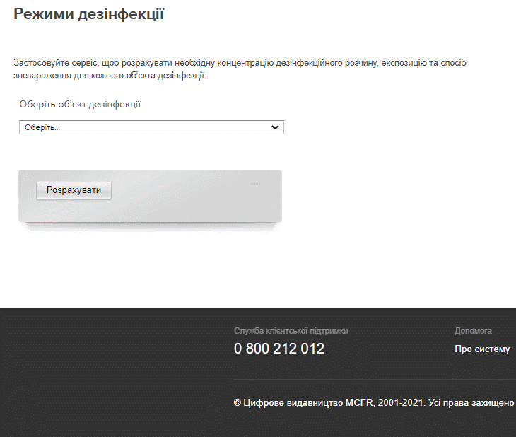 Застосовуйте сервіс, щоб розрахувати необхідну концентрацію дезінфекційного розчину, експозицію та спосіб знезараження для кожного об’єкта дезінфекції.