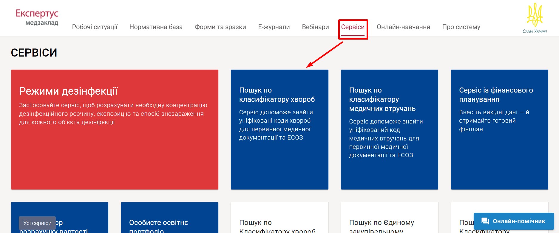 Сервіс «Класифікатор хвороб» ми розмістили в розділі «Сервіси».