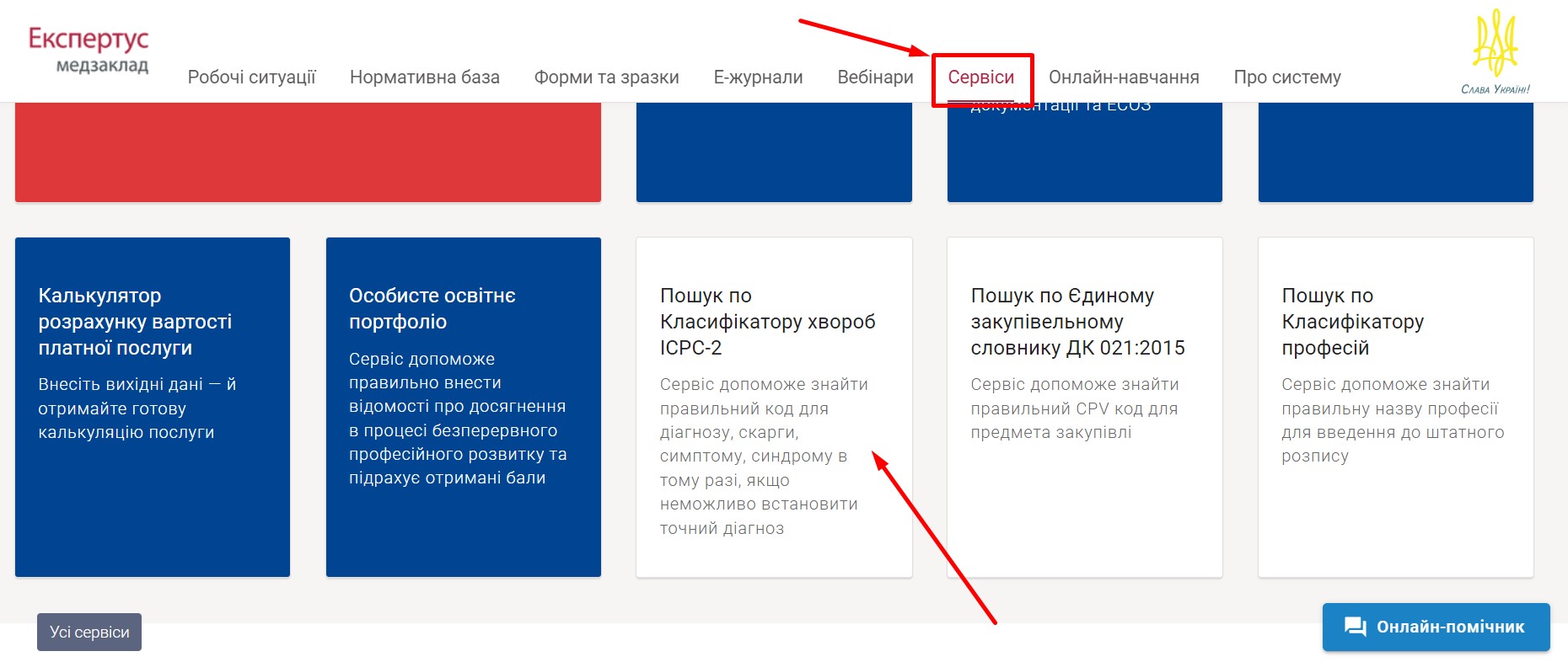 Ми розмістили Пошук по Класифікатору хвороб ICPC-2 в розділі «Сервіси».