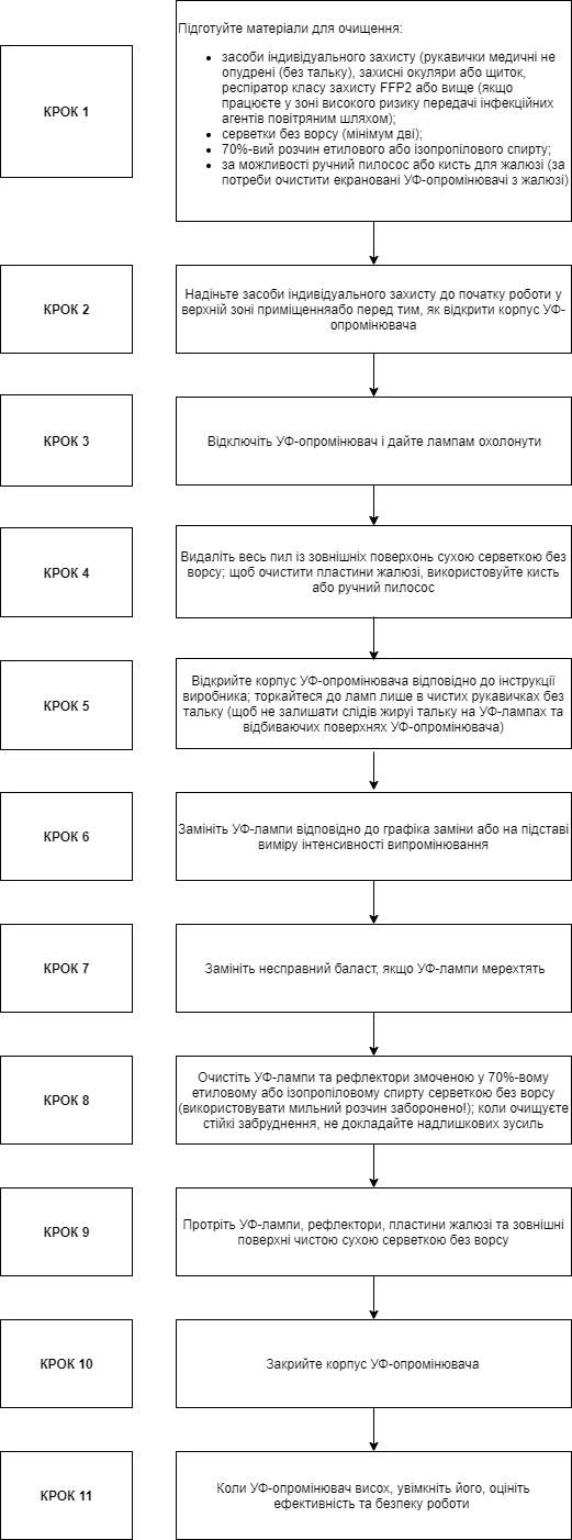 Примітка. Очищуйте УФ-опромінювачі та УФ-лампи відповідно до рекомендацій виробника. Якщо таких інструкцій немає, дотримуйте цієї покрокової інструкції, яка розроблена згідно з пунктом 28 Санітарно-протиепідемічних правил і норм використання ультрафіолетового бактерицидного випромінювання для знезараження повітря та дезінфекції поверхонь в приміщеннях закладів охорони здоровʼя та установ/закладів надання соціальних послуг / соціального захисту населення, затверджених наказом МОЗ від 06.05.2021 № 882.