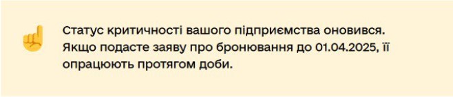 Граничний строк дії бронювань працівників тих підприємств, що не отримали новий статус критичності, — 31 березня 2025 року. Якщо підприємство вже оновило критичність, можете перебронювати працівників на новий строк (рис. 1).